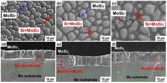 Liquid-phase deposition technology inserts the refractory metal alloy into the alloy melt and prepares the intermetallic compound coating by a thermal diffusion reaction in a vacuum or inert gas atmosphere [82,83]. It is considered to be a promising surface coating technology for the oxidation protection of refractory metals [84]. The process details of liquid deposition technology for the preparation of Mo surface Si/Al coatings are shown in Table 8. It can be seen that hot dip time and temperature have important effects on coating composition, thickness and surface grain size [85,86,87,88,89]. Under high temperature and an Ar protection atmosphere, an intense diffusion reaction occurs between liquid silicon and substrate, and columnar MoSi2 grains rapidly grow on the substrate’s surface, as shown in Figure 15b. The thickness and surface grain size of the coating increase gradually with the increase of hot dip temperature and time. A thin interface layer (Mo5Si3/Mo3Si layer) with low silicon concentration is observed at the bottom of MoSi2 grain, as shown in Figure 15c. Zhang et al. [90]. reported a Si-MoSi2 coating on Mo substrate by the liquid deposition Si technology. The coating mainly consists of a MoSi2 outer layer and Mo5Si3/Mo3Si interface layer, and the outer layer coating has a high surface silicon concentration and low roughness surface. It is worth noting that the surface of the coating has no cracks, holes and other defects. They find that the surface silicon concentration and grain size increase with the increase of deposition temperature and holding time, and the same conclusion has been reached by Wang et al. [89]. They report Al–Mo coatings with excellent oxidation resistance on the surface of Mo by the liquid-phase deposition Al technology. The Al–Mo coatings are mainly composed by out layer (Al-Al12Mo or Al-Al4Mo layer) and interface layer (Al8Mo3-Al4Mo or Al8Mo3 layer), and the interface layer is thicker than the outer layer. The SEM images of the liquid-phase deposition coatings are shown in Figure 16 [87]. The coatings surface are very smooth and dense, almost no cracks and holes are observed. In addition, high silicon concentration has been observed at MoSi2 grain boundaries, as shown in Figure 16a–c. The cross-sectional morphology shows that the silicide coatings are composed of MoSi2 columnar crystals with a thin transition layer (Mo5Si3 and Mo3Si), as shown in Figure 16d–f.
