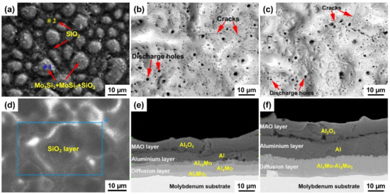 The images of oxidized liquid-phase deposition coatings on Mo substrate are shown in Figure 18. After oxidation at 1200 °C for 2 h, the surface of Si-MoSi2 coating is relatively rough with a small amount of pores, composed of SiO2, Mo5Si3 and MoSi2, as shown in Figure 18a [85]. However, a smooth and dense SiO2 protective film forms on the coating surface when the oxidation temperature is 1600 °C, as shown in Figure 18d [89]. This is due to the good fluidity of SiO2 at high temperature (above 1400 °C), which can fill the defects on the coating surface [90]. The oxidation mechanism and microstructure evolution of the coatings are shown in Figure 19. Compared with MoSi2 phase, Si has a stronger affinity with oxygen in a high-temperature oxidation environment. Therefore, the silicon preferentially is oxidized to SiO2, reducing the formation of volatile MoO3. In order to improve the oxidation resistance of the Al–Mo coating, the coatings obtained at different hot dip temperatures are subjected to micro-arc oxidation (MAO) treatment (pre-oxidation). There are a lot of holes on the oxidized coating surface, which has typical MAO process characteristics, as shown in Figure 18b,c. The outer layer of the coatings is composed of Al2O3, the middle layer is an unoxidized aluminum dipping layer, and the inner layer is a diffusion layer of hot-dip aluminum, as shown in Figure 18e,f. The formation of the structure has great significance for delaying the diffusion of oxygen and prolonging the oxidation service life of the coating [88].