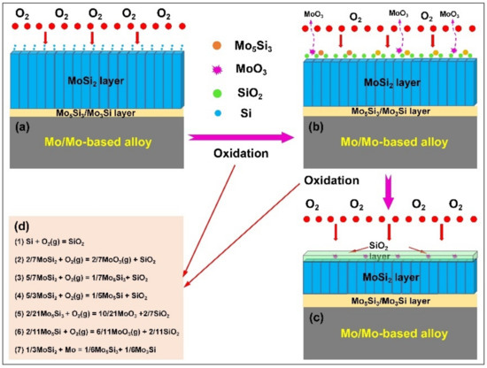 The diagram of oxidation mechanism of liquid-phase deposition coatings on Mo and its alloys. (a–c) are the coating structures before, during and after the oxidation reaction. (d) is the reaction equation involved in the oxidation process.