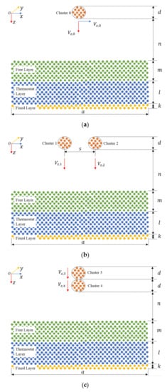 3.4. Two Clusters Arranged Vertically at the Different Incident Velocities in Model 3
