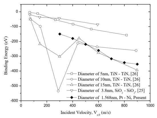 In order to characterize the deposition of Pt clusters onto Ni substrate during the process of CGDS, the normal velocity, the tangential velocity and the self-rotation (around the x-axis through the center of mass of the cluster in the y–z plane and around the z-axis through the center of mass of cluster in the x–y plane) were firstly simulated. Furthermore, the interactions between two clusters arranged horizontally and vertically in the depositing process were studied, respectively. Binding energy was employed to judge the bonding strength between the clusters and substrate, and a larger absolute value of binding energy suggested a higher bonding strength [24,25,26,38,39,40]. The binding energy of this paper was compared with that in the literature [25,26] to verify the reliability of MD simulations and that their trends were in good agreement, as shown in Figure 2. Additionally, the mean-squared displacement (MSD) of atoms inside the free layer was an important parameter to reflect the plastic deformation of the substrate, and a larger value of MSD implied the formation of metallurgical bonding, due to the particles’ deeper embedding into the substrate [23]. The local atomic density could be described by the radial distribution function (RDF, also called g(r)), and the value of peak is used to characterize the order degree of the crystal-structural properties, as this was usually viewed as a sign of the metallurgic bonding [14,15,17,24].