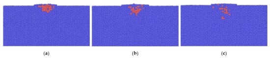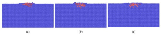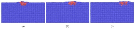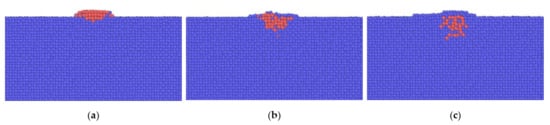 Morphology snapshots (side views of the center section along x–z plane) of Cluster 0 and substrate after impacting at the different in Model 1: (a) , (b) and (c). In all cases, and .