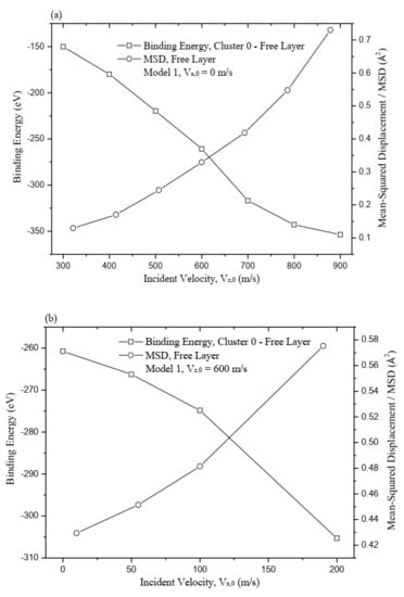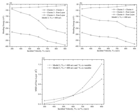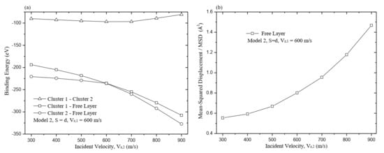 Figure 5a displays the binding energy between the cluster and the free layer, and the MSD of the free layer obtained at the different and . It is observed that both the absolute values of binding energy and the MSD value increase at the larger . Moreover, the absolute value of binding energy increases the most as varies in the range from to , whereas the increment slightly decreases as is higher than . In the meantime, the MSD increases the most in the range of . Thus, the substrate deformation and the bonding strength are not always in sync when the impact velocity is over the critical range. Thus is because the shear instability takes place at , and the mechanical interlocking gradually tends to fail at , due to the penetration. The same phenomenon is found in the literature [24,25,26]. In addition, it can be seen from Figure 5b that both the absolute values of binding energy and the MSD value increase with the rising , and their increments are fairly consistent. Thus, one higher tangential speed of the cluster can lead to a stronger bonding force between the cluster and the substrate, and this is attributed to the wider physical trapping in the substrate.