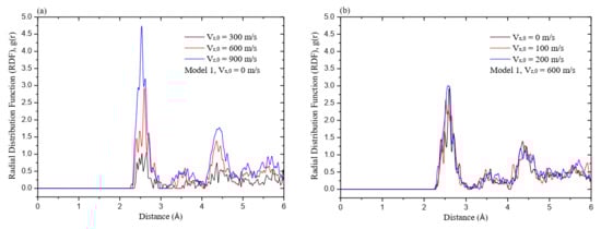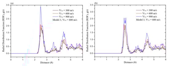 The RDFs at the different and are plotted in Figure 6. The value of each peak becomes larger when the incident increases (see Figure 6a), suggesting the crystal order degree of the whole system enhances after depositing with increasing . Thus, more metallic bonds are formed between Pt and Ni atoms and the metallurgic bonding is intensified, as is in line with the results in the literature [14,15,17,24]. However, the peak values almost keep the same as the tangential velocity increases in Figure 6b, meaning that the tangential velocity () has little or no effect on the formation of metallurgic bonding.