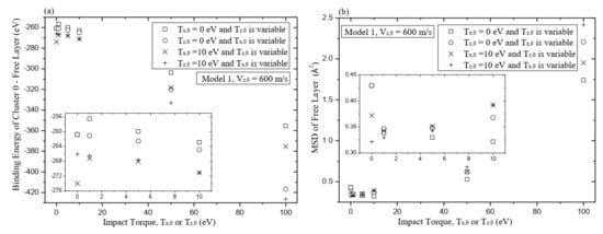 The changes in the binding energy between Cluster 0 and the free layer with the impact torque are plotted in Figure 9a. The absolute value of the binding energy between the cluster and the free layer presents a remarkably increasing trend, as a larger is considered. Thus, the self-rotation around x-axis can always enhance the bonding strength, which is attributed to the increase in the mechanical interlocking and metallurgic bonding induced by the thermal-softening effect on the substrate. Meanwhile, the absolute value of the binding energy firstly decreases and then increases with the increasing . Although the mechanical interlocking becomes stronger with Pt atoms scattering into Ni substrate in the x–y plane, the metallurgic bonding is first weakened and then intensified. Comparing the symbols × and +, the impact torque around z-axis plays a dominant role in the bonding force, as and are both less than 10 eV, while the impact torque around x-axis improves the bonding strength more as and are both higher than 10 eV.