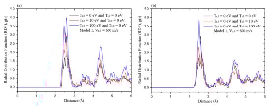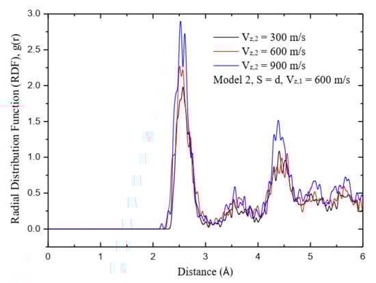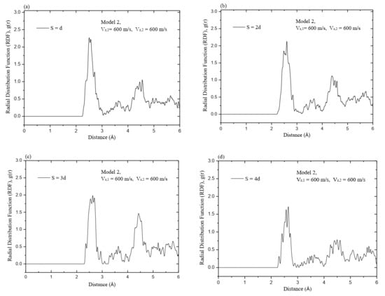 As shown in Figure 15a,b, the bonding strength between Cluster 3 and the substrate and between Cluster 4 and the substrate both dramatically enlarge with increasing and . It is attributed to the peening effect from Cluster 3 to Cluster 4 and the thermal-softening effect from Cluster 4 to Cluster 3. The bonding strength between Cluster 3 and Cluster 4 slightly decreases as one of and increases, as is illustrated by the symbol □ in Figure 15a, b. It indicates that the collision between the two clusters arranged vertically for anywhere and anytime can make both of their distances longer because of the momentum conservation, which weakens the bonding strength between them. In addition, Cluster 3 must collide against Cluster 4 during the flying course at and , and they only happen to collide with each other on the substrate at and . Comparing Figure 15a with Figure 15b, it can be observed that the bonding strength between the clusters and the substrate is larger as the two clusters collide with each other before impacting onto the substrate, and vice versa. The collision during the flying course rises the incident velocity of the first cluster and decreases that of the latter cluster according to the momentum conservation, which shortens the interval time of the two clusters separately impacting the substrate, and then largely weakens the cooling and solidification of the softened substrate. Comparing the symbols × with + in Figure 15c, we can see that the substrate deformation is smaller as the two clusters impact the substrate without collision with each other during the flying course. It is also attributed to a larger velocity difference between the two clusters that can lead to a longer cooling and solidifying time after the first cluster has arrived at the substrate. Figure 16 shows that the crystal order degree of the whole system is improved at the larger and , resulting in a stronger metallurgic bonding. Comparing Figure 16a with Figure 16b, we can see that the RDF values at and are higher than the ones at and , and the values at and are higher than the ones at and . It also suggests that the metallurgic bonding is enhanced if the velocity difference between the two clusters reduces through the momentum exchange before impacting onto the substrate.
