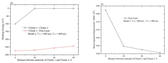 Figure 13a shows that the absolute value of the binding energy between the two clusters tends to be zero, as they have no contact with each other, and the binding energy between any one cluster and the free layer presents a slightly decreasing trend, as the two clusters are far away from each other. The reason is that the weakening thermal-softening effect at the larger S gives rise to the decreasing mechanical interlocking and metallurgic bonding between any one cluster and the substrate. Since the thermal-softening effect from any one cluster to the other one is weakened with the increasing S, the substrate deformation also presents a decreasing trend, as can be observed in Figure 13b. Figure 14 shows that the peak values of the RDFs decrease as S becomes larger, thus further verifying the decrease in the metallurgic bonding.