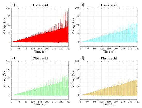 Figure 2. Voltage–time trend of PEO-treated samples in (a) acetic, (b) lactic, (c) citric and (d) phytic acids.