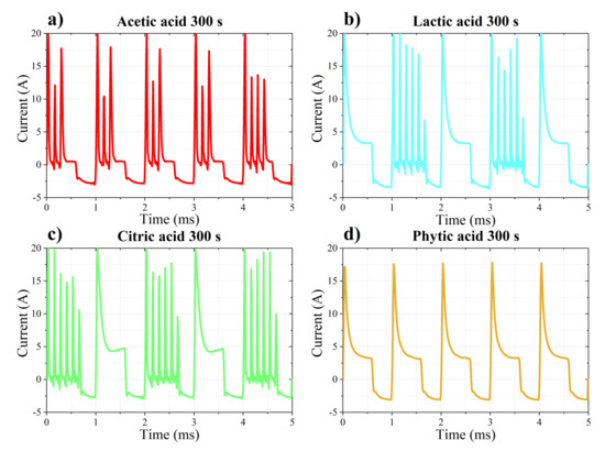 Therefore, the absence of I surges is an indication of the higher ionic contribution with respect to the electronic one required to sustain the multitude of sparks. Similarities were instead observed in Figure 3b,c confirming the close trend highlighted in Figure 2b,c, where an intermediate behavior between phytic and acetic acids (the latter probably showing a lower level of ionic current) was established. Interestingly, the trend seemed to correlate not only with the acidity constant of the organic additives used in the present analysis and corresponding to ~1.5 for phytic, ~3.13 for citric, ~3.86 for lactic and ~4.76 for acetic acids [28,29] but also and more importantly with the molecular weight of the organic acids considered to be fully deprotonated in such a high-pH environment.