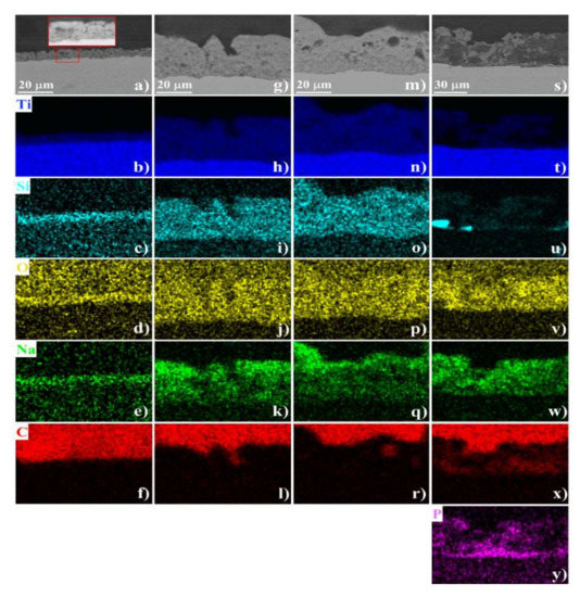 After encapsulation, in epoxy resin, and cutting by metal shearing, sample cross-sections were analyzed by SEM-EDS and the results are highlighted in Figure 5. In agreement with previous observations, advanced by looking at Ti XRD reflections, PEO-AC determined the lower oxide growth (~4.5 µm), while, when using phytic acid as organic additive, a coating of ~32.5 µm developed. Similar I trends resulted in comparable thicknesses for the samples PEO-LA (~19.35 µm) and PEO-CI (~19.53 µm). Morphology was greatly affected by the type of additive used in the electrolytic bath; in fact, when using acetic acid, a coating mainly constituted by agglomerated particles resulted. Two layers composed PEO-LA, PEO-CI and PEO-PH (see Figure 5g,m,s), namely, one in contact with the metal with similar features to PEO-AC and one thick upper region with evidence of densification occurred by the plasma generated during the process. PEO-PH, in particular, appeared quite friable, as part of the coating was often detached during the encapsulation procedure in the epoxy resin.