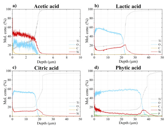 The thickness values seemed to well agree with the data extracted via SEM, confirming PEO-AC to be the thinner oxide and the addition of phytic to favor the growth of the thickest coating. Looking at the molar concentration of the elements present in the sample PEO-AC (Figure 7a) permitted us to speculate the synthesis of structures different from TiO2 and SiO2, such as titanium silicide. However, as the former phase was not detected by the previous XRD analysis, it should be assumed the formation of an amorphous structure if present. In the case of PEO-LA and PEO-CI, similar elemental profiles were observed to agree with the previous I trend and XRD analysis, highlighting TiO2 polymorphs, amorphous SiO2 and low quartz as the main phases. Interestingly, both PEO-CI and PEO-PH presented a smoother transition of Ti in correspondence of the oxide–metal interface, probably according to the formation of low valence oxide phases localized in the oxide region immediately in contact with the metallic substrate [37]. Apart from the sample PEO-AC, a Si peak denoted accumulation in correspondence of the metal–oxide interfacial region. C content was relatively low in all cases apart from the sample PEO-AC, correlating with previous EDS observations, while the presence of P for the sample PEO-PH was confirmed and enhanced at the coating bottom.