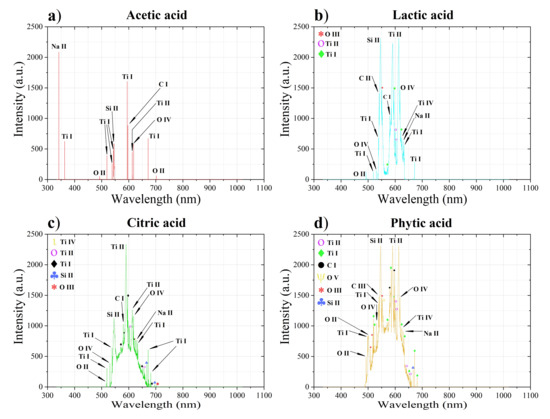 The main elements participating in the optical emission events were labeled according to the NIST database [38]. Generally, the most intense lines belonged to Ti, O, C and Si species. Interestingly, in case of PEO-AC, where a less developed spectrum agrees with a lower plasma intensity, Ti I (594.175 nm) was the most intense line, as opposed to other conditions facing Ti II (590.163 nm) as the species responsible for the most relevant optical transition. Apart from PEO-AC, all the treatments produced the transition line Ti IV (at 624.774 nm) related to the Ti3+ species. In addition, neutral carbon (C I) was always detected, while C2+ (C III at 540.836 nm) contribution was registered only when using phytic acid. The same result can be highlighted for Na II, O II and O IV, while O III was present in all treatments apart from PEO-AC.