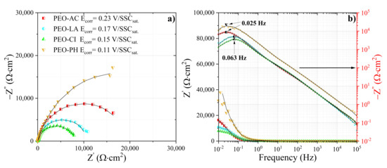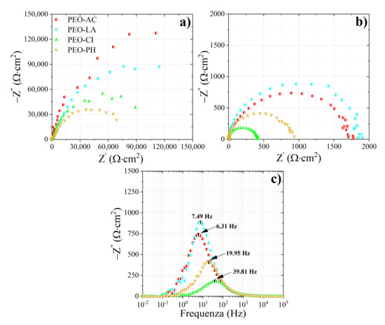 The considerably higher impedances observed in the case of PEO-AC suggest the stronger tendency of acetates to limit charge transfer reactions at the electrode, while the contrary holds true in the case of phytic acid, favoring anodic reactions to occur. Things were different if performing EIS at 1.5 V/SSCsat, where the markedly lower impedance values and the formation of capacitive arcs, intersecting the real impedance axis, demonstrated higher dissolution currents to flow. The negative imaginary impedance plotted in Figure 11c is very informative about the time scale of the anodic dissolution process occurring over the electrode, with time constant inferable from the maximum of the -Z″ peak. This information, combined with the charge transfer resistance Rct, extractable from the intersection of the arc in Figure 11b with Z′, allows the capacitance C of the system to be calculated as in Equation (6).