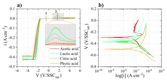 However, since, after the anodic wave, i stabilized towards low anodic values, sudden repassivation with formation of TiO2 was expected to happen. As the anodic current peak (iaCV) was lower, ~0.004 A·cm−2, in the case of PEO-AC, it was reasonable to assume the adsorption of acetates to control and limit both titanates’ formation and subsequent repassivation, compatibly with the huge anodic Tafel coefficient ba ~3780 mV·decade−1, collected in Table 6, after Tafel analysis. Metal passivation was more efficient when using phytic and lactic acid. This can be demonstrated by the lower cathodic current plateau, ic, observed at very cathodic potentials limiting the kinetics of water reduction. On the other hand, in the presence of acetic acid, ic was substantially higher, sign that, after the anodic cycle, substrate passivation was less effective. Even if these results can be used to justify the overall lower oxide growth, they do not provide explanation for why acetic acid should favor the retention of such a high level of Si inside the material, leading to the speculation about the formation of titanium silicide-like phases. The justification of the latter finding deserves more in-depth studies and will be afforded in future papers.