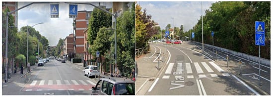 The two mid-block crossings object of study was located in the urban area of Bologna, Italy, inside the residential zone. The mid-block crossings were placed along the Azzurra and Mainoldi streets, both single carriageway-two lanes roads with a width of about 7.00 m (two 3.50 m wide lanes) and a speed limit of 50 km/h (Figure 1).