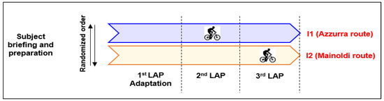 The subjects had to drive the car along a circuit with a total length of 7.5 km, designed to include the two mid-block crossings object of study (Figure 1). The task consisted of three laps along the circuit: the first one was aimed to allow the driver to take confidence with the road and the devices; in the other two laps the participant had passed two times from each studied bicycle crossing, once with and one without cyclist presence at the crossing, in a randomized order. In this study, the cyclist has been simulated by involving actors, and the cyclist has always appeared from the right side of the road, where the cyclist was completely visible to the driver. The participants did not know about the possible presence of cyclists (Figure 3).