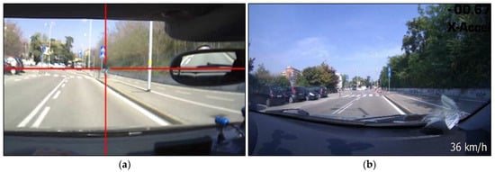 The video analysis started by synchronizing the eye-tracking videos from the ASL mobile eye tracker with the VBOX videos, which allows associating the drivers’ visual gaze behavior with the driver’s speed. The eye-tracking video for each participant is a video from the scene showing the eye fixation position with a red cross. This video allowed us to study drivers’ gaze points and fixations (Figure 4).