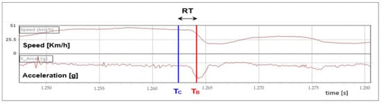 The ET and speed data were also used to evaluate the drivers’ reaction time (RT) for each mid-block crossing object of study. The RT was defined as the difference between the time of the first visualization of the cyclist on the right side of the crossing (TC) and the initial time of braking (TB). The time of application of the brake of the driver was found by using the speed profile and verified with the longitudinal acceleration measured by the IMU (Figure 5). The RT is commonly used to evaluate the safety of a cyclist/pedestrian crossing. It depends on task demands, motivation, cognitive workload, and even fatigue. The driver reaction process consists of perception, recognition, decision, and physical response [,]. To avoid accidents, the RT should be shorter so that the driver was able to stop the vehicle safely before the crossing.