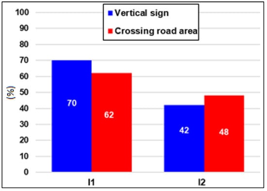 Figure 6 shows the results in terms of the percentage of drivers that looked (fixation) at crossing area and vertical signs at the two bike crossings object of study. The statistical analysis underlines a significant increase in drivers who looked at the portal overhead bicycle/pedestrian crossing sign (+28%, χ2 = 6.05, p = 0.002) and at red colored pavement (+4%, χ2 = 3.25, p = 0.002) of the “I1” crossing. The results were determined by 72 observations (18 participants—2 crosswalks—2 sides).