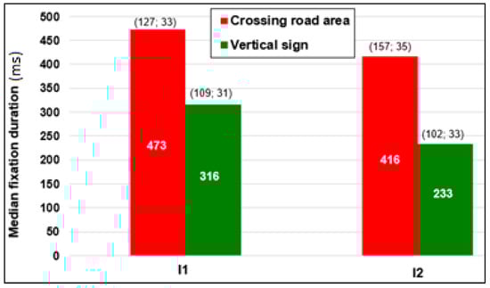 Median fixation duration at crossing road area (pavement) and at vertical signs (portal overhead bicycle/pedestrian crossing sign for “I1” and “Yield here to pedestrians and cyclists” vertical sign for “I2”) (standard deviation and number of observations are reported in brackets).