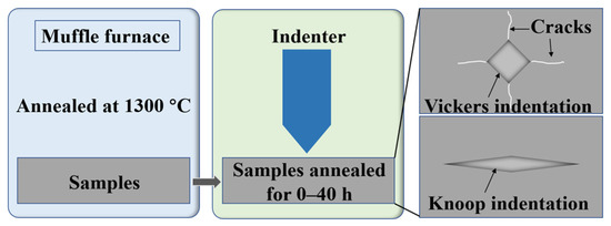 To evaluate the high-temperature phase stability of the samples, the as-sintered bulks are heat treated at 1300 °C for different times. We previously found that, for as-sintered t′-YSZ, a certain amount of m-ZrO2 was generated after annealing at 1400 or 1500 °C for 20 h. It is well-known that the fracture toughness of m-ZrO2 is essentially inferior to that of t′-ZrO2. Additionally, the grain of m-ZrO2 grows abnormally. A previous study confirmed that the fracture toughness of YSZ was related to the grain size. To eliminate the effect of the grain size on the fracture toughness, 1300 °C was selected as the annealing temperature. The crystal structure of the materials is characterized through X-ray diffraction (XRD, D8 Advance, Bruker, Karlsruhe, Germany) from 20° to 80° utilizing CuKα radiation (λ = 1.5406 nm). To better distinguish the t′, t and c phases, a slow scanning speed of 0.1° min−1 at 72°–76° is performed.