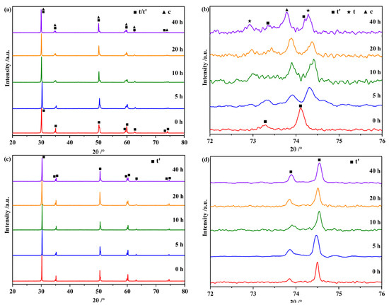 Figure 3 displays the phase content variation of YSZ and ScYSZ samples when increasing the annealing time. For the conventional YSZ material, the t′ phase content decreases rapidly before the first 5 h, and it decreases to approximately 32 vol.% after being annealed for 40 h. No m phase is detected during this thermal exposure process. Different from the free-standing coatings, the substrate in TBCs leads to compressive stress in the coating, reducing the amount of m phase. Similarly, the dense YSZ bulk exhibits compressive stress, which can effectively inhibit the formation of m phase. Our previous study showed that the m phase content of YSZ bulks was only about 5.40 vol.% even when heat-treated at 1500 °C for 100 h [24]. Therefore, the m phase is not easy to generate in such a short annealing time at 1300 °C.