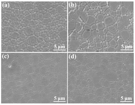 The fracture toughness value is an important factor for determining the performance of TBCs. Figure 4 shows the fracture toughness evolution of different samples during the heat treatment process. The value of the as-sintered pure t′-YSZ sample (5.00 ± 0.30 MPa·m1/2) is higher than that of t′-ScYSZ (4.30 ± 0.30 MPa·m1/2). The toughness value of ScYSZ shows a prominent stability during the high-temperature thermal exposure. However, the value of the fracture toughness of the YSZ sample gradually declines with the increase of the annealing time, and it becomes lower than the value of ScYSZ after annealing for 5 h. The value is about 3.20 ± 0.24 or 4.22 ± 0.18 MPa·m1/2 for the YSZ or ScYSZ sample after being heat-treated for 40 h, respectively, which suggests that ScYSZ has more potential advantages for the long-term operation of high-temperature TBCs. It is well-known that the fracture toughness of nano-sized YSZ is related to the grain size [32]. Figure 5 shows the SEM images of bulks before and after annealing at 1300 °C. It can be seen that the grain size of the as-sintered YSZ or ScYSZ is in the range of 1–5 μm. A slight grain growth is observed after annealing for 40 h. However, the grain size of YSZ is close to that of ScYSZ. Therefore, the effect of the grain size on the fracture toughness of the YSZ or ScYSZ sample is negligible. As mentioned in Figure 2 and Figure 3, ScYSZ bulks remain pure t′ phase during the high-temperature annealing process, while the content of the t phase or c phase of YSZ bulks gradually increases with the heat treatment going on, indicating that the content of t′-ZrO2 is the decisive factor for the durable fracture toughness of ScYSZ. Due to the larger tetragonality of the as-sintered t′-YSZ, the fracture toughness is higher than that of as-sintered t′-ScYSZ, which is also consistent with the results of the literature [22,24]. A previous study [20] demonstrated that the fracture toughness of t′-ZrO2 was higher than that of c-ZrO2 due to the unique ferroelastic domain-switching toughening mechanism of the former. The external stress causes the c-axis re-orientation of the t′-ZrO2 in the unit cell, which dissipates the fracture energy at the crack tip and thus inhibits the crack propagation. Therefore, the fracture toughness of YSZ gradually decreases during the annealing process. These results further indicate that ZrO2-based ceramics with a high t′-phase stability are preferable for high-performance TBCs.
