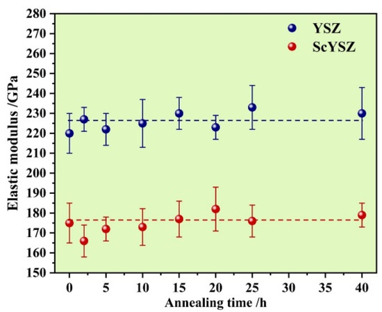 Figure 6 depicts the evolution of the elastic modulus during the heat treatment. It can be seen that the elastic modulus of all samples is nearly stable and that the value of ScYSZ is approximately 50 GPa lower than that of YSZ. The reduced elastic modulus is beneficial to lowering the thermal mismatch stress between the ceramic layer and the bond coat and to thus improving the service life of TBCs. Additionally, the elastic modulus of a certain solid compound is an intrinsic property, which is closely related to the cohesive energy of the lattice [11]. It is not sensitive to the microstructure except for porosity. The porosities of as-sintered YSZ and ScYSZ bulks are 0.92% and 0.96%, respectively. After annealing for 40 h, the values of the porosity decrease slightly to 0.87% and 0.88%. Since the as-sintered samples are relatively dense and no obvious porosity change occurs during the aging process, the elastic modulus of YSZ or ScYSZ is stable at elevated temperatures.