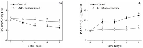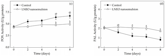 The activities of enzymes (POD and CAT) related to the antioxidant system in fresh-cut muskmelons are shown in Figure 3. Antioxidant system can protect against oxidative stress and delay fruit senescence. Increases in the activity levels of POD and CAT antioxidant enzymes lead to an increase in reactive oxygen species (ROS), thereby reducing fruit quality [31]. Figure 3 shows that in both muskmelon samples, activities of POD and CAT increased during 8 days of storage. It was speculated that the increase in activities of antioxidant enzyme was related to the mechanical damage to muskmelons during fresh-cutting. However, the POD activity of the LNEO nanoemulsion-treated samples was significantly lower than that of the control during storage (p < 0.05). As shown in Figure 3a, the activities of POD in the uncoated and coated samples after 8 days of storage was 33.12 ± 2.42 and 18.45 ± 1.82 U/g protein, respectively. At the end of storage, the POD activity of the control sample was 1.80 times that of the LNEO nanoemulsion treatment. The CAT exhibited the same activity trends as POD. The CAT activity of the LNEO nanoemulsion-treated samples was significantly lower than that of the control throughout the storage process (p < 0.05; Figure 3b). As shown in Figure 3b, the activities of CAT in the uncoated and coated samples during 8 days of storage were 19.39 ± 1.50 and 9.367 ± 0.913 U/g protein, respectively. At the end of storage, the activity of the control sample was 2.07 times higher than that of the LNEO nanoemulsion treatment. Owing to the inhibition of antioxidative enzyme activities (CAT and POD) possibly by the antioxidant activity of LNEO [32], the LNEO nanoemulsion treatment maintained the antioxidant system of the fresh-cut muskmelons to a certain extent.