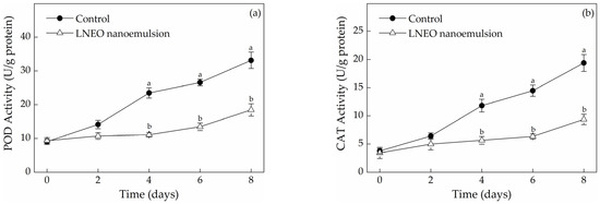 Effects of the LNEO nanoemulsion on activities of POD (a) and CAT (b) in fresh-cut muskmelons. Data are the mean ± standard deviation (n = 3); a, b different letters denote statistical significance.