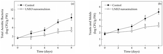 Effects of the LNEO nanoemulsion on the microbial growth (log CFU/g FW) in fresh-cut muskmelons: total aerobic bacteria (a); molds and yeasts (b). Data are the mean ± standard deviation (n = 3); a, b different letters denote statistical significance.