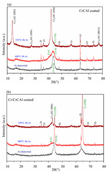XRD patterns of as-deposited, 400 °C- and 550 °C-annealed coated Zircaloy-4. (a) CrCAl-coated and (b) Cr/CrCAl-coated.