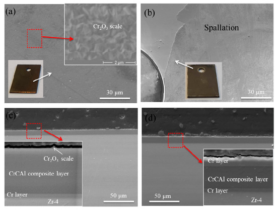 Surface appearances and cross-sectional SEM images of 400 °C-annealed, coated Zircaloy-4 after autoclave test at ~330 °C and 18 MPa for 30 days. (a) CrCAl-coated surface; (b) Cr/CrCAl-coated surface; (c) CrCAl-coated cross section; (d) Cr/CrCAl-coated cross section.