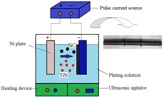 Ni/TiN-SiC nanocomposites were synthesized on dumbbell samples using the PCE method using a modified plating solution comprising 28 g/L NiCl2, 195 g/L NiSO4, 28 g/L H3BO3, 70 mg/L cetyltrimethyl ammonium, 8 g/L TiN nanoparticles, and 8 g/L SiC nanoparticles. The diameters of SiC and TiN nanoparticles range from 30 to 40 nm. The anode was a pure nickel plate (120 mm × 40 mm × 20 mm), while a specimen of sporting equipment (Φ30 mm × 120 mm) served as the cathode. Between the two electrodes, a spacing of 180 mm was maintained. Figure 1 illustrates the experimental equipment used to synthesize Ni/TiN-SiC nanocomposites. The pulse current source (SMD-200, Handan Electroplating Factory, Handan, China), heating device, ultrasonic agitator (XIL-500, Beijing Xili Technology Co., LTD., Beijing, China), and plating bath were all included in the device. Pulse current densities of 2, 4, and 6 A/dm2 were generated using a pulse current generator with a duty cycle of 40%. A heating system was used to maintain the plating solution at 45 °C. The ultrasonic agitator was used to maintain a uniform suspension of disseminated SiC and TiN nanoparticles within the solution of plating. The plating solution was adjusted to a pH of 4.7 by adding either sodium hydroxide (12 wt.%) or hydrochloric acid (15 vol.%), and the plating time was set to 40 min. The plating time was determined based on our previous study [7].