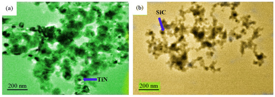 The morphological structures of the nanoparticles of SiC and TiN are shown in Figure 2. SiC and TiN nanoparticles were individually poured into an ethanol solution. Additionally, then they were dropped on a glass sheet. After a drying treatment, the glass sheets were tested by the TEM. Using the Nano Measurer 1.2 software, ten distinct SiC and TiN nanoparticles were measured, as shown in Figure 2a,b, respectively. According to the findings, the average diameters of SiC and TiN nanoparticles were 35 and 40 nm, respectively. These nanoparticles tend to agglomerate due to their surface effects. Additionally, in the microregions, regular crystal formations were manifested by SiC and TiN nanoparticles.