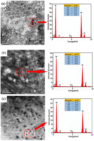 Figure 4 demonstrates the micrographs of TEM for Ni/TiN-SiC nanocomposites generated as a function of diverse pulse current densities. In Figure 4a–c, the black parts depict SiC and TiN nanoparticles, while nickel grains are depicted by the white regions. Some SiC and TiN nanoparticles were observed on the Ni/TiN-SiC nanocomposite deposited at 2 A/dm2, whereas multiple SiC and TiN nanoparticles were incorporated at 4 A/dm2. SiC and TiN nanoparticles were found to have average sizes of 45.6 and 37.5 nm, respectively. This could presumably be a consequence of the moderate pulse current density, resulting in a large number of SiC and TiN nanoparticles embedded into the Ni/TiN-SiC nanocomposite. This result produced an effective inhibition of the growth of nickel grains. Nevertheless, the Ni/TiN-SiC nanocomposite deposited at 6 A/dm2 processed comparatively large nickel grains with a small amount of SiC and TiN nanoparticles. The reason for this can be explained by the fact that the high pulse current density produced a large amount of hydrogen on the cathode surface, limiting the deposition of SiC and TiN nanoparticles on the coating surface. As a result, the nickel granules in the coatings expanded rapidly, but the SiC and TiN content remained low.