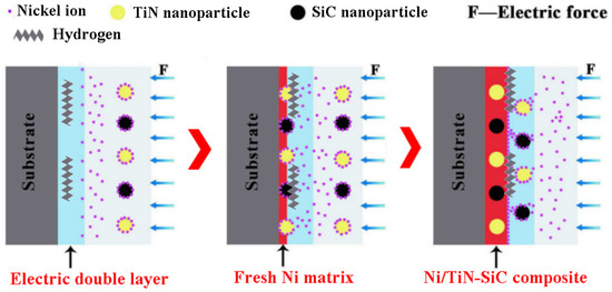 The mechanism of co-deposition for the nickel irons, SiC, and TiN nanoparticles.