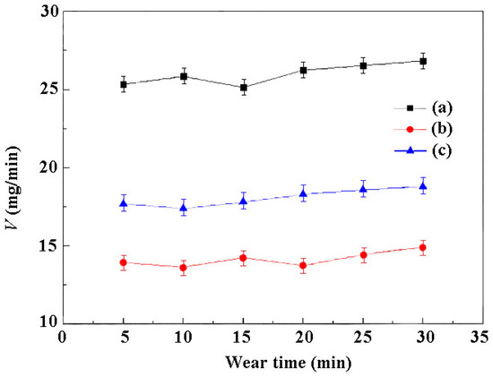 Wear rates of Ni/TiN-SiC nanocomposites generated with diverse pulse current densities: (a) 2 A/dm2, (b) 4 A/dm2, and (c) 6 A/dm2.