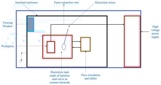 Plasma electrolytic oxidation (PEO) is a surface treatment method used for obtaining oxide coatings on metals, such as Al, Mg, and titanium. The coating obtained has excellent properties, such as high corrosion resistance, wear resistance, and electrical insulation. These coating properties help them to be used in applications such as medical, aerospace, automotive, oil, and gas industries [,,]. PEO is an anodic oxidation process. During the PEO process, the alloy to be oxidized is the anode. A shrouding environment of oxygen is ensured around the anode throughout the oxidation process. A high voltage is applied between the anode and the second electrode, usually in the range of tens of voltage to hundreds of volts. The applied voltage is sufficiently high to ensure continuous sparks across the electrolytic environment, separating the anode and the second electrode. The voltage exceeds the dielectric breakdown potential for the growing oxide film. Generally, stainless steel container is used to hold the electrolyte, and it also serves as the second electrode. The pictorial representation of PEO is represented in Figure 1. Sparks and associated chemical reactions ensure a ceramic oxide coating that is less porous on the anode surface. As a result, the coating will have high adhesion to the substrate [].