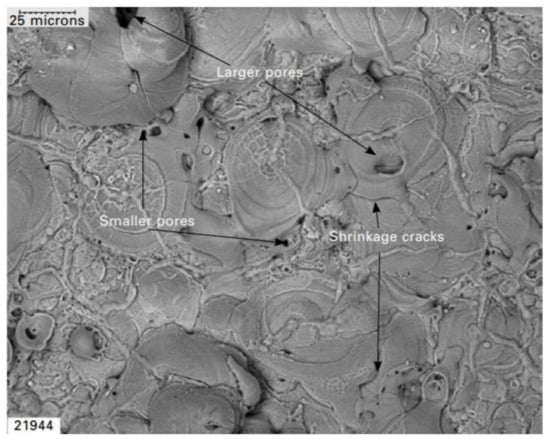 Malayoglu et al. [] used PEO to create an oxide coating on the AA6082 alloy, and further, they studied their mechanical and tribological properties. The coating consisted of crystalline α-Al2O3 and γ-Al2O3 phases, and after the PEO coating, the samples exhibited improved hardness and elastic modulus values. Further, PEO-coated samples also demonstrated increased adhesion strength and excellent wear resistance. Typical features of a PEO coating are presented by Shrestha et al. []. Though they had taken the AA6082 alloy as the substrate (Figure 6), the features remain true for the PEO coating and any 6xxx series alloy. It comprises several large pores of 5–10 µm, microscale pores of size < 2 μm, along with shrinkage cracks created during PEO. The coating is relatively dense (though some porosity exists), and the microstructure comprises circular fused ceramic grains formed by quenching of molten pools of oxide material.