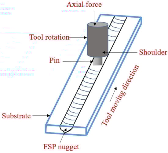 Friction stir processing (FSP) is a surface modification technology based on the principles of friction stir welding (FSW), which is helpful in enhancing specific properties by facilitating local microstructural change [,]. FSW is used to join more than one plate or sheet, whereas FSP is used to process the base material to enhance its surface properties by refining the grain structure, adding a second phase material, altering the distribution of second phase material, etc. Figure 7 demonstrates the schematics of the FSP. Here, a rotating tool with or without a pin and shoulder would be inserted into the monolithic or substrate materials. It would rotate and move with respect to the substrate, causing intense plastic deformation, material mixing, refinement, temperature rise, etc., leading to the desired surface modification. It has multiple benefits, such as solid-state microstructural evolution, fine-tuning of mechanical properties using optimized tool design and process variables, controlling the location and depth of the processed zones, the absence of deleterious gas production, and minimum materials distortion. Friction stir processing could be employed with or without the addition of second phase particles. When a second phase material is added during FSP, the second phase may act as a reinforcement phase, pinning point, and controlling point for grain refinement, may react with the substrate to cause a new strengthening phase, etc. [,,].