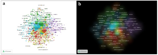(a) Keywords of “nanoparticles/nanomaterials and seed germination” co-occurrence network visualization; (b) keywords of “nanoparticles/nanomaterials and seed germination” density visualization. The “curves” are the representatives of co-occurrence between the connected “nodes”, and each node denotes a “keyword”. Different keywords were segregated into different clusters, shown in different colors.