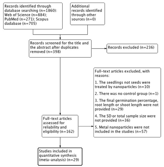 Thus, understanding the phytotoxic behavior of the metal NPs is necessary before using them under field conditions [2]. There were some reviews and systematic assessments concerning the metal NP effects on crop growth, while few meta-analyses could be found. Meta-analysis, mainly used in medical science, is a useful approach to explore whether metal NPs can promote seedling growth or not [15,16]. Therefore, the aim of this study was to explore the effects of metal NPs on the final germination percentage (FGP), root length (RL), and shoot length (SL) of the agricultural species through a meta-analysis to provide a meaningful reference for the wider utilization of the metal NPs, such as with forest species.