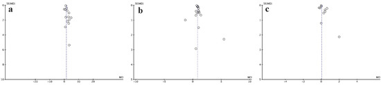(a) Funnel plot for FGP; (b) RL; and (c) SL. The dotted lines represent the overall effects; hollow circles represent the studies.