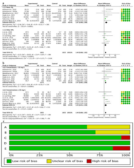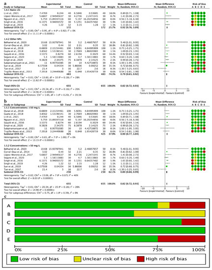 Heterogeneity evaluation, subgroup analysis, and risk of bias assessment for SL. (a) Subgroup analysis for NP types; (b) subgroup analysis for NP concentrations; (c) risk of bias assessment.