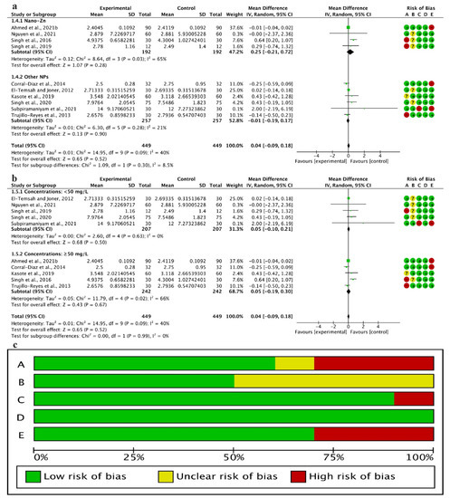 Heterogeneity evaluation, subgroup analysis, and risk of bias assessment for FGP. (a) Subgroup analysis for NP types; (b) subgroup analysis for NP concentrations; (c) risk of bias assessment, A—sterilizing the seeds used in all treatments, B—seed germination and seedling growth under controlled conditions, C—seed exposure to a direct nanoparticle suspension, D—uniformity of the seeds, E—cultivation of the seeds on the filter papers inside Petri dishes (the same below).
