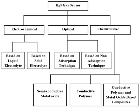 First, a chemically selective layer, which works as a sensing material, changes its electrical conductivity under the influence of a particular gas. The second unit is a physical transducer; it reads the conductivity changes of the sensing material and converts it into an analytical signal [2]. Though various chemical sensors have been developed for H2S gas-sensing applications, chemiresistive, optical and electrochemical sensors are the most widely studied which can be further classified as shown in Figure 1.