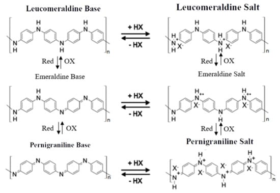 - Khalid, M.; Honorato, A.; Varela, H. Polyaniline: Synthesis methods, doping and conduction mechanism. In Polyaniline—From Synthesis to Practical Applications; IntechOpen: London, UK, 2018. [Google Scholar]