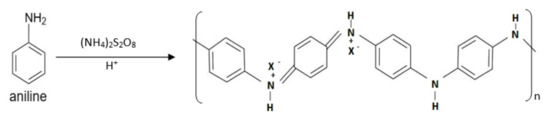 For the synthesis of polyaniline (ES), the chemical oxidation polymerization method was used. In general, the chemical synthesis of polyaniline (ES) involves the oxidization of an aniline monomer with the help of oxidizing agents such as hydrogen peroxide (), ammonium persulfate , ferric chloride , ceric nitrate and ceric sulfate in an acidic medium (, ). The oxidizing agent helps in removing protons from the aniline monomer unit without the formation of a coordinate complex at lower potential. The repeating monomer units are conjoined together by redox reaction, as shown in Figure 6, which completes the polymerization process [24].