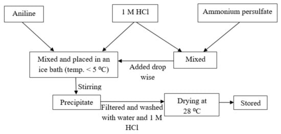 Initially, 4.65 g of aniline was dissolved in 100 mL of 1M HCl to get the mixture. The temperature of the mixture was then allowed to decrease to below 5 °C by employing an ice bath. A separate pre-cooled solution of 100 mL of 1M HCl containing 11.40 g of was prepared. This separated solution was further mixed in the aniline and 1M HCl in a drop-wise manner under constant stirring. The mixture was allowed to stir until completion of the reactions. It took about 4 h for the reaction to be completed. There was a precipitate in the solution which was further filtered for recovery of the produced polymer. For eliminating un-reacted chemicals, the precipitate was washed thoroughly with the help of distilled water and 1M HCl. The obtained sake-like sample of the polymer was allowed to dry at room temperature (28 °C) and stored in an airtight glass bottle [25].